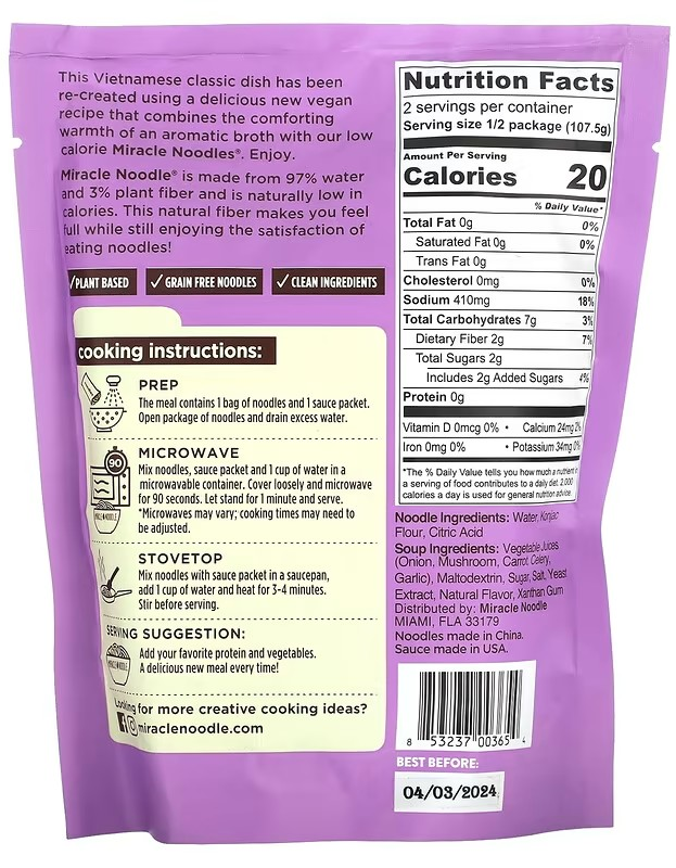 Miracle Noodle, Keto Meal, Vegan, Gluten Free, Vegan Pho + Plant Based Noodles, 215g